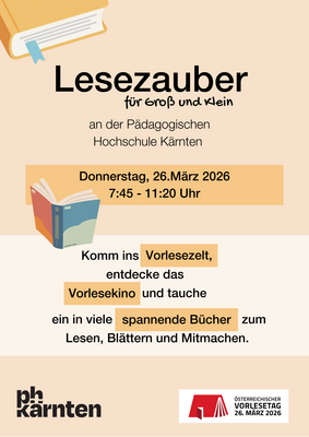 Die Pädagogische Hochschule Kärnten beteiligt sich auch dieses Jahr wieder am Vorlesetag und lädt am Donnerstag, 26. März 2026, von 7:45 bis 11:20 Uhr zu besonderen (Vor-)Leseerlebnissen ein. Komm ins Vorlesezelt, entdecke das Lesekino und tauche ein in viele spannende Geschichten.